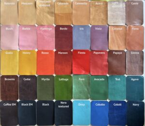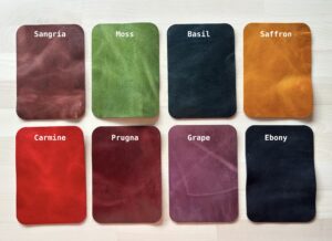 Missouri leather: Acorn, Bordo, Cedar, Coconut, Cobalt, Flamingo, Fern, Grape, Maroon, Navy, Onyx, Sienna, Teal (La Perla Azzurra, Italy – 1,5 mm)