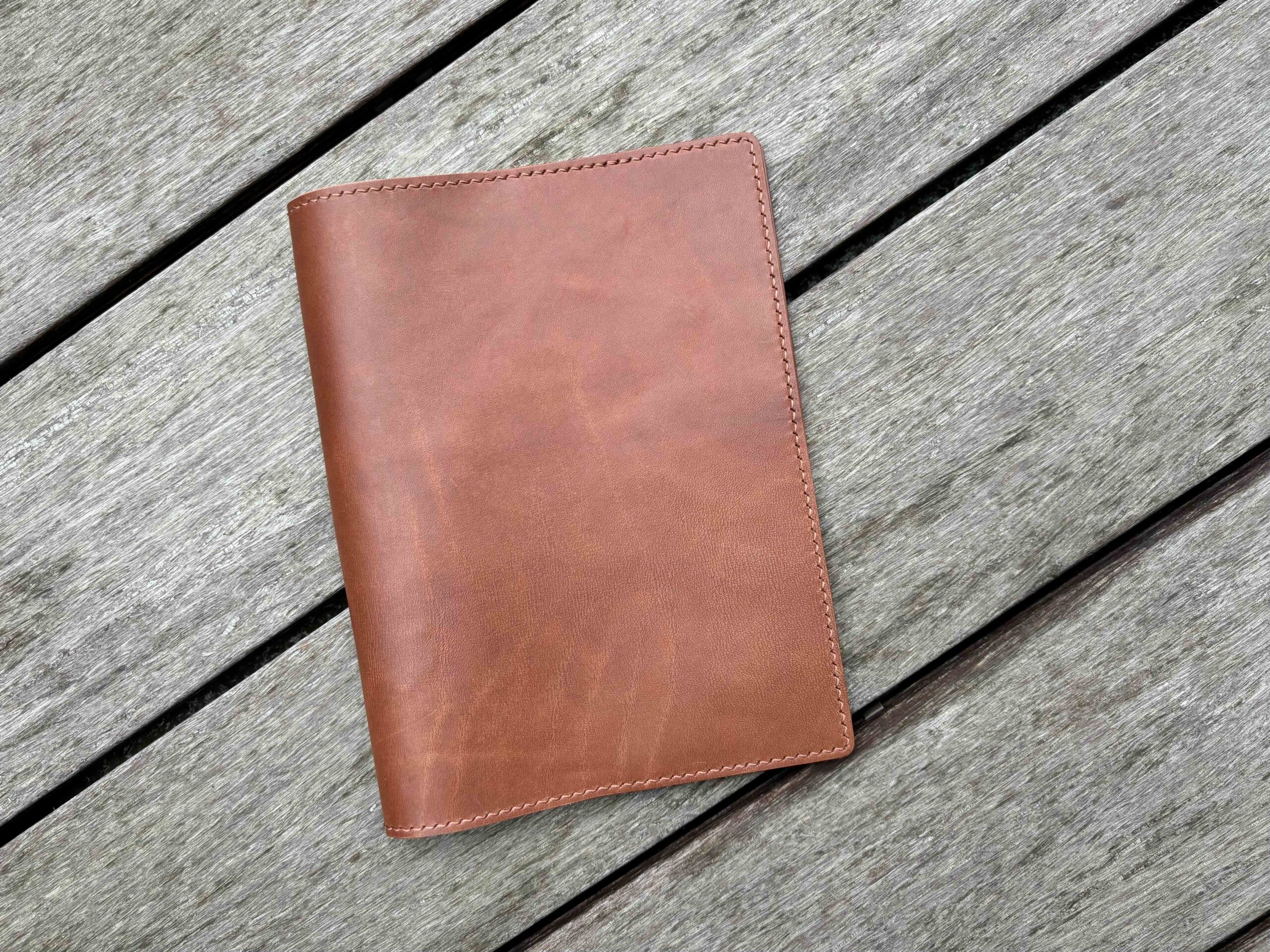 Each full-grain leather hide (1.3- 1.5 mm thick) is unique, with natural variations in color, texture, and markings like scars, stamps on the flash side or stretch marks. These characteristics contribute to the rustic, vintage look of our handmade covers. If you prefer leather with fewer natural marks, please let us know in the order comments—we will do our best to accommodate your request.