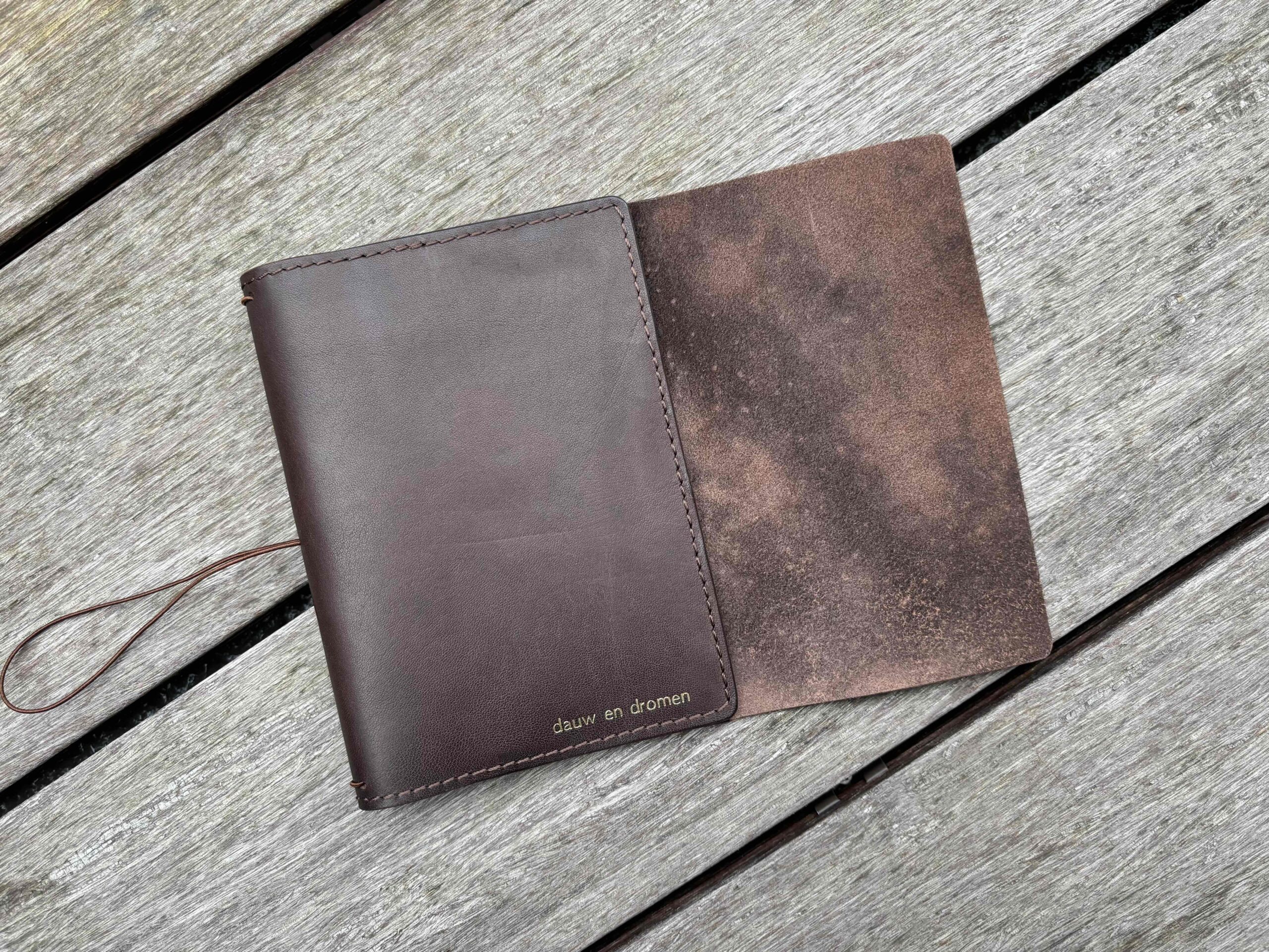 Each full-grain leather hide (1.3- 1.5 mm thick) is unique, with natural variations in color, texture, and markings like scars, stamps on the flash side or stretch marks. These characteristics contribute to the rustic, vintage look of our handmade covers. If you prefer leather with fewer natural marks, please let us know in the order comments—we will do our best to accommodate your request.