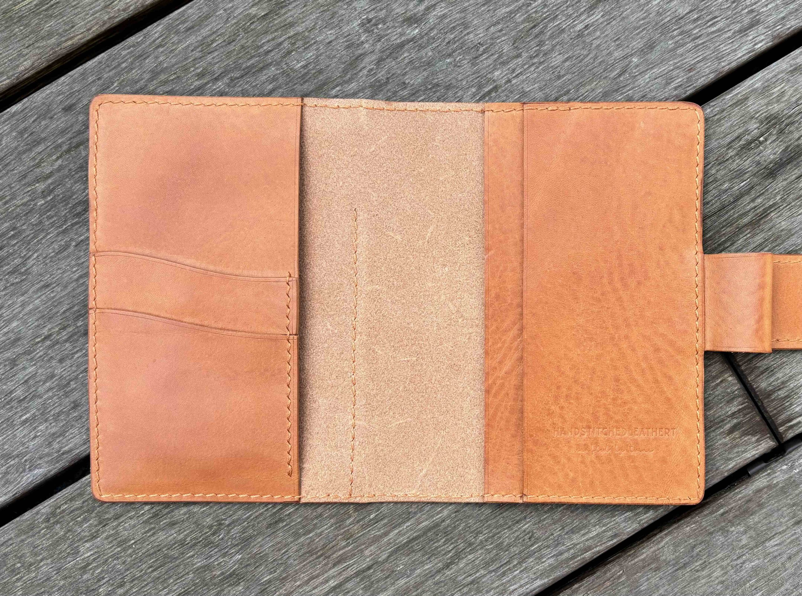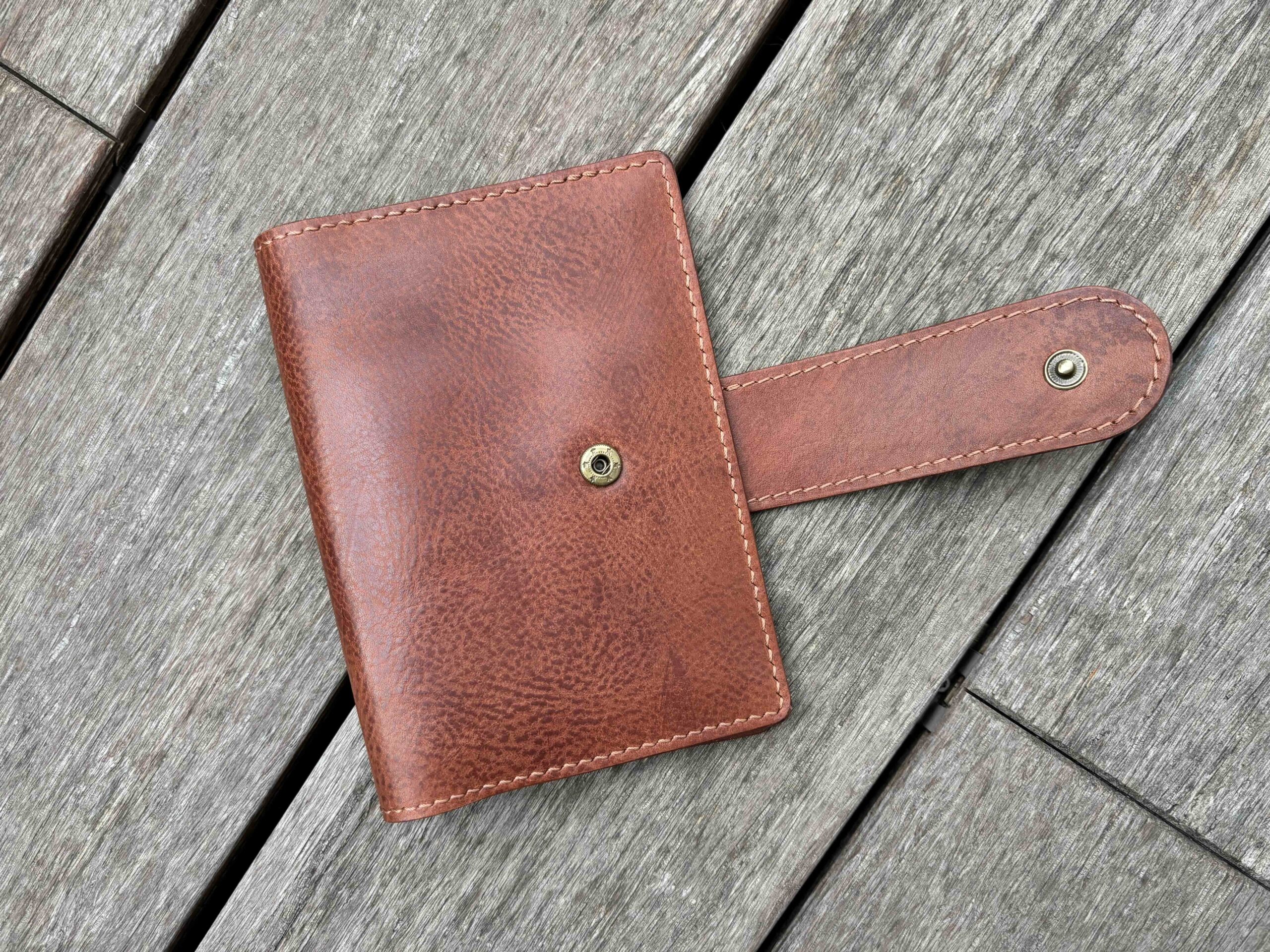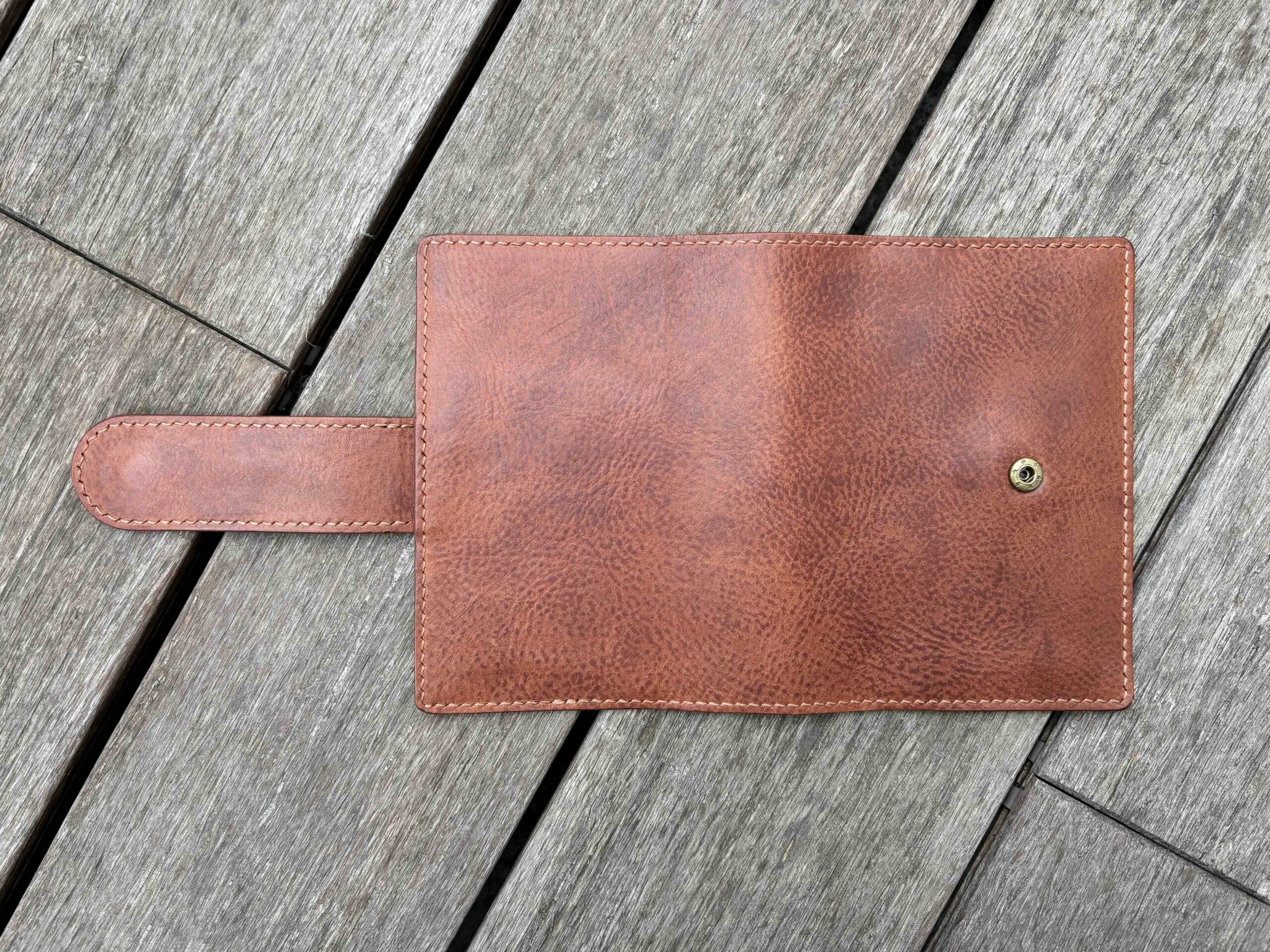 Each full-grain leather hide (1.3- 1.5 mm thick) is unique, with natural variations in color, texture, and markings like scars, stamps on the flash side or stretch marks. These characteristics contribute to the rustic, vintage look of our handmade covers. If you prefer leather with fewer natural marks, please let us know in the order comments—we will do our best to accommodate your request.