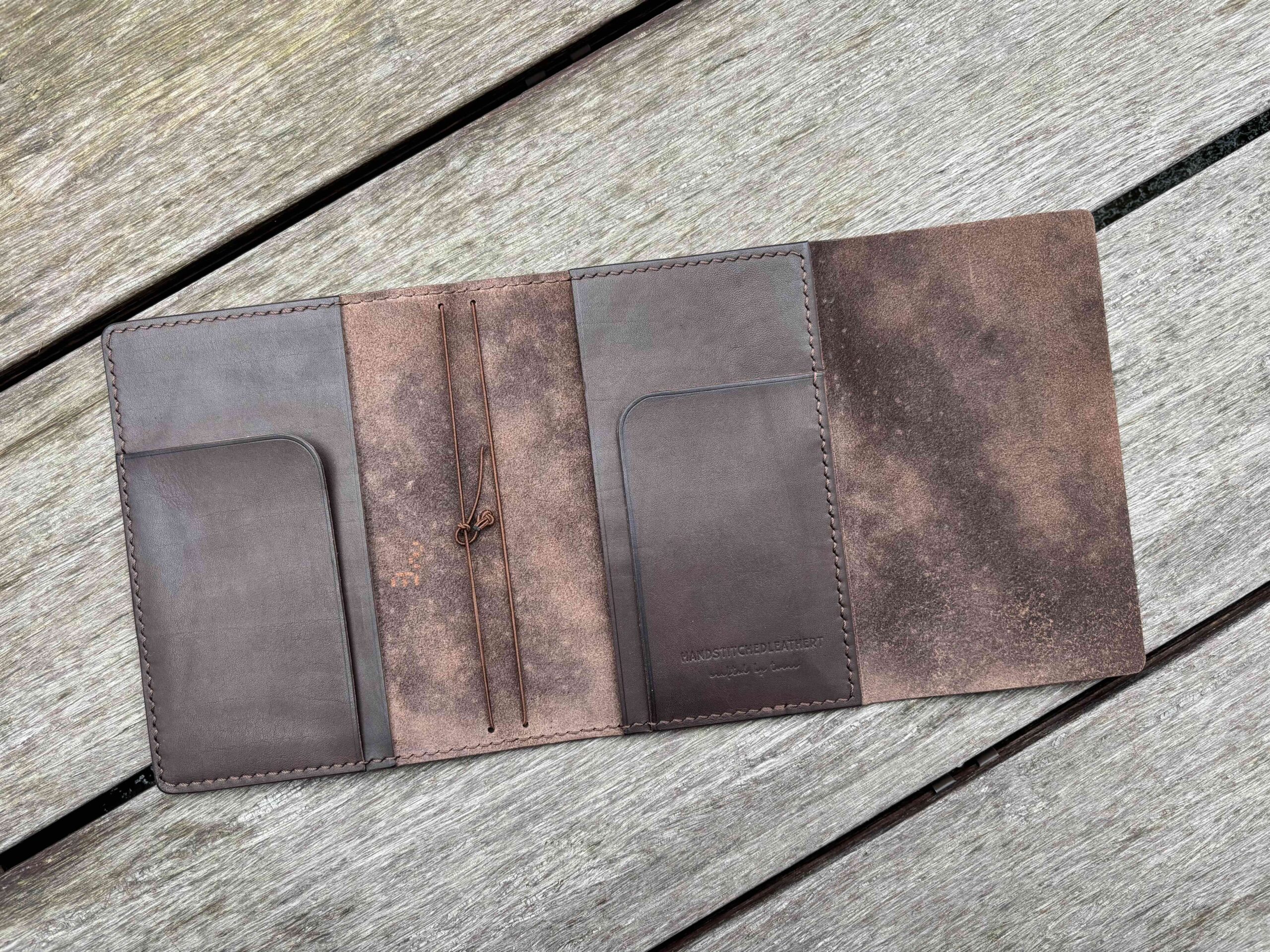 Each full-grain leather hide (1.3- 1.5 mm thick) is unique, with natural variations in color, texture, and markings like scars, stamps on the flash side or stretch marks. These characteristics contribute to the rustic, vintage look of our handmade covers. If you prefer leather with fewer natural marks, please let us know in the order comments—we will do our best to accommodate your request.